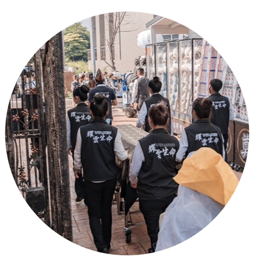 依照家屬意願進行火化或土葬或環保葬安排,包含出殯行列、扶棺、辭靈儀式、發引隊伍等全程協助,讓儀式圓滿完成。